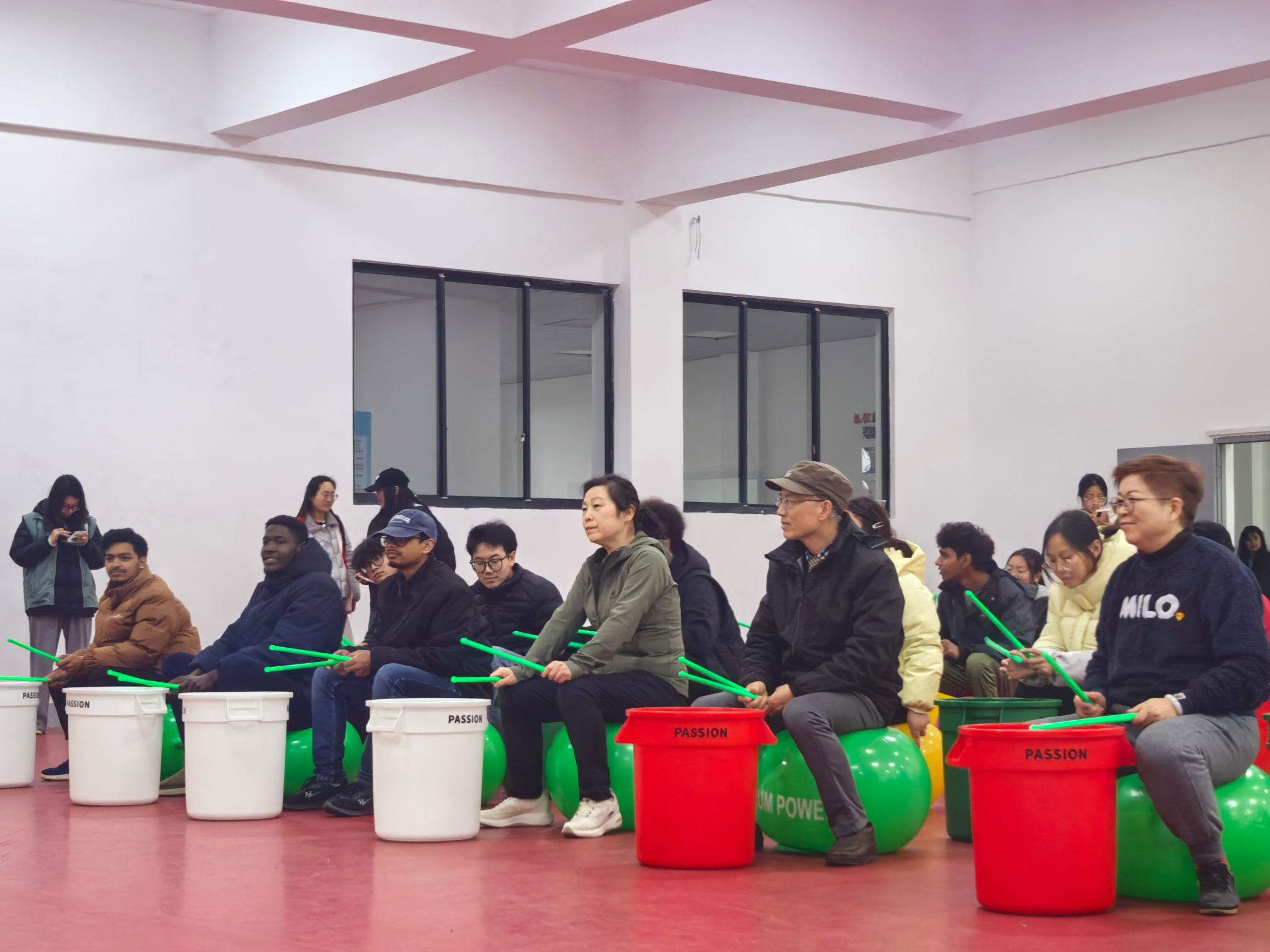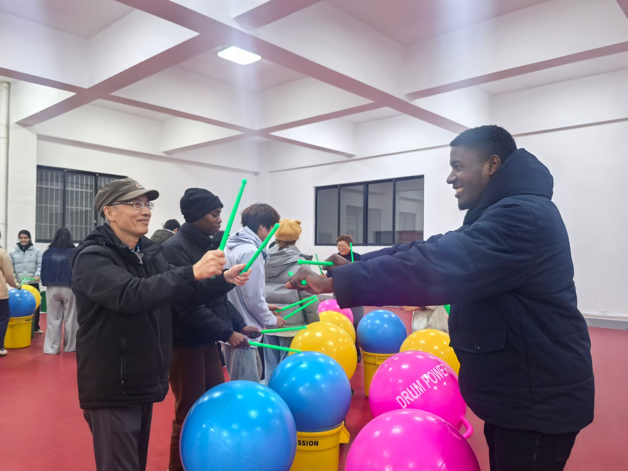 活动在充满动感的《健康到到令》旋律中拉开序幕。在辅导员林佳燕的引导下,师生通过击鼓传声开启破冰之旅。随着《快乐小马》《改变自己》等曲目的切换,师生状态渐入佳境。“启动与暂停的互动游戏,锻炼了大家的反应力与节奏感;“四球游戏”中,不同颜色的球对应特定动作,考验着参与者的记忆、节奏感与即时表现力。在“模仿与创编”环节,中外学子混合编组,两人或三人成队,轮流担任引领者与跟随者,共同创编节奏与动作。虽然存在语言交流的不畅,但肢体、表情的模仿与眼神的交汇,迅速构建起了彼此超越言语的默契。跟随者在聆听、观察中去感知、回应对方的动作变化;引领者在被模仿的过程中感受到“被看见”“被理解”,这种双向的、非语言的互动,不仅消融了文化背景的隔阂,更让每一位参与者在即兴的共创中,体验到被尊重、被理解的深层愉悦。最后的“同心圆”环节,将现场氛围推向高潮关工委的老同志们积极参与其中,与年轻学子一同击鼓、舞动,展现出昂扬的热情,传递着关爱与鼓励。