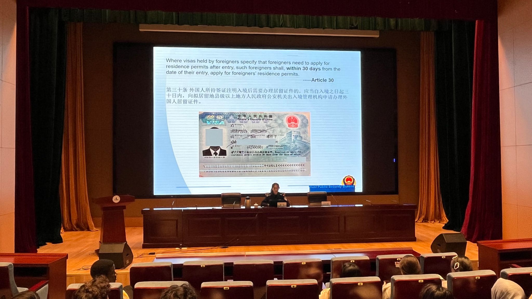 2025年11月10日下午,无锡市公安局出入境管理处张莉警官应邀莅临学校,为全体来华留学生带来了一场主题鲜明、内容实用的出入境法规专题讲座。本次讲座面向来自亚洲、非洲、欧洲共18个国家的136名留学生,旨在提升留学生们对在华法律法规的认知,保障其在中国学习期间合法、顺利地居留与生活。